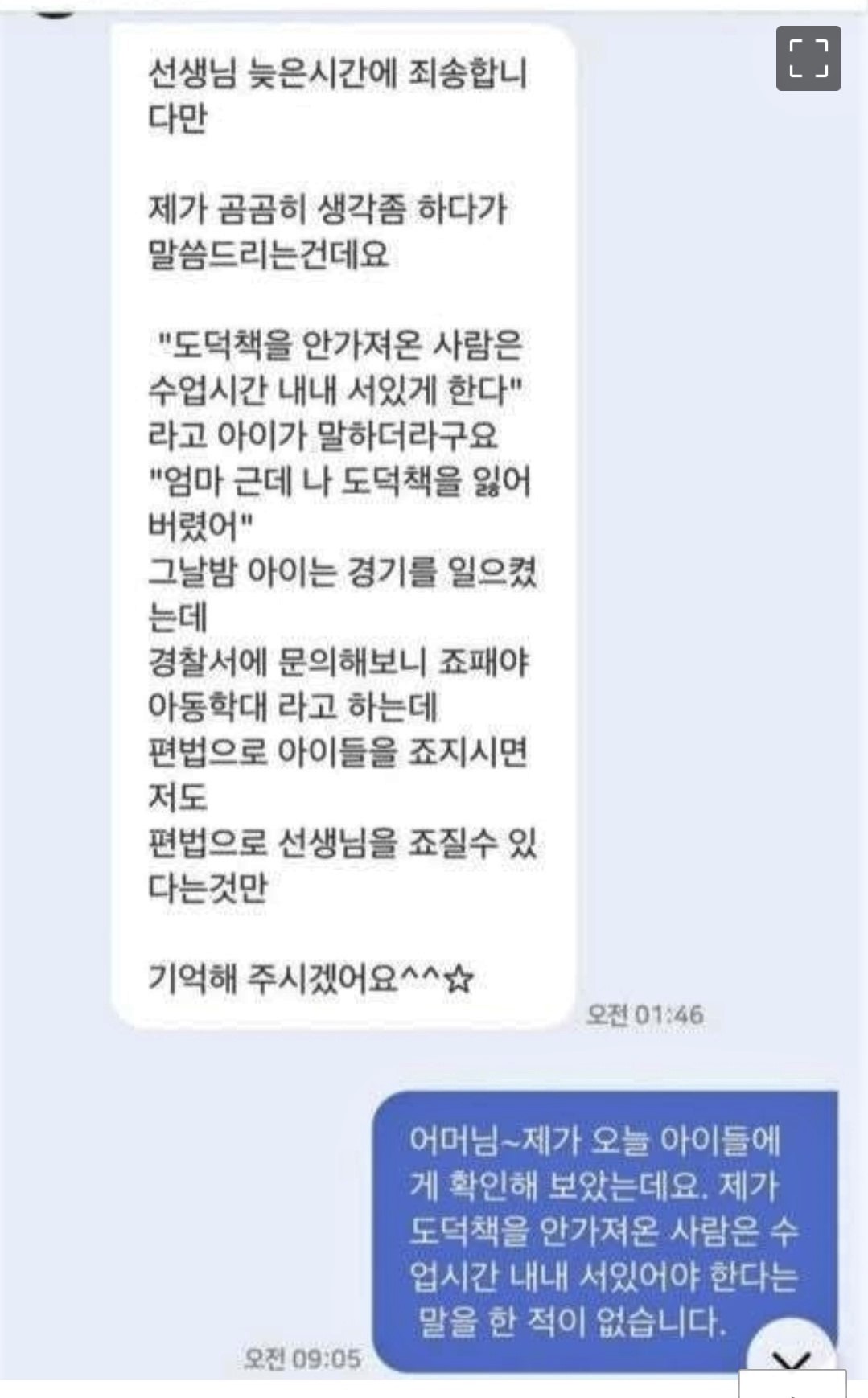 인터넷에 공개된 문자 내용이다. 그 선생님, 더 참담했을 것이다. 하긴, 교사가 교실에서 커피 마시는 것이 ‘아동학대’ 아닌지 따져 드는 세상이다. 그러면, 이런 문자는 어떠한가. 역시 이번 사건을 계기로 공개된 어느 교사와 학부모의 문자 대화이다. 학부모가 담임교사에게 문자 보낸 시간은 새벽 1시 46분.