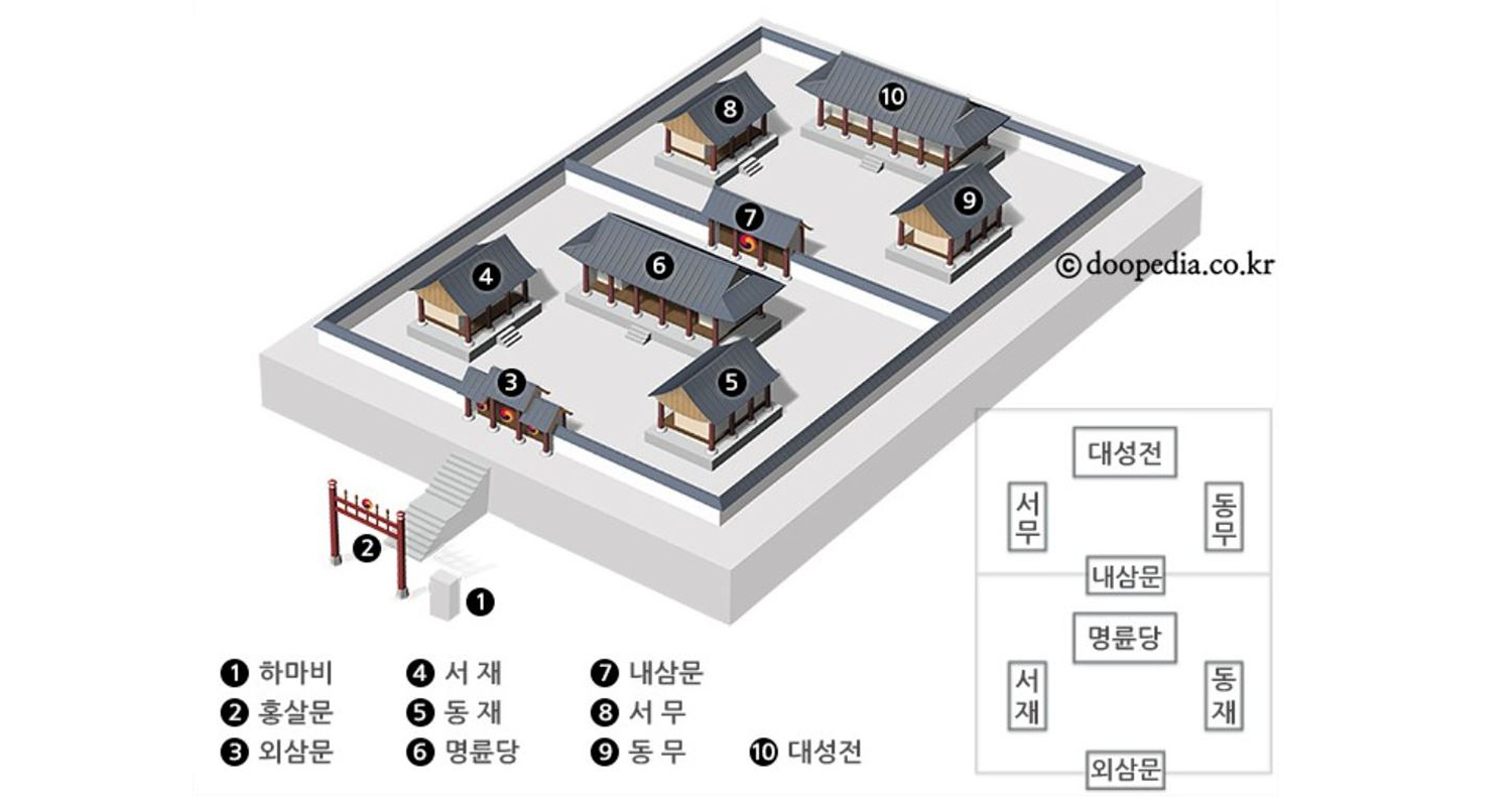 지난 57호에서 충렬사의 성격을 알아보았습니다. 이번 호에서는 충렬사 수직방과 전사청에 관해 조금 말하려고 합니다. 그러기 전에 향교와 서원의 개념과 건축 구조부터 검토할게요. 충렬사와 비교하기 위함입니다.