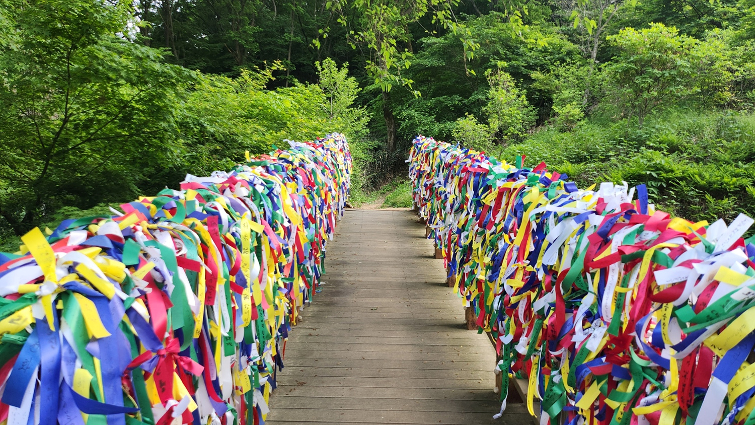 다리 옆에 리본과 연필을 비치해서 누구나 합격 기원 리본을 달 수 있다.
