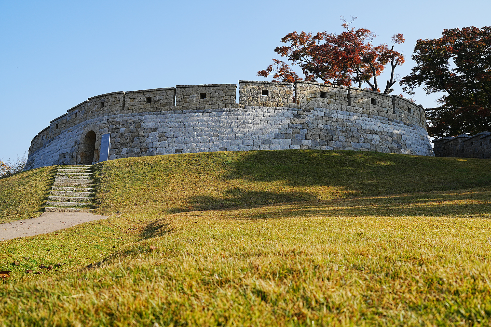 내 바로 앞에서 걷는 이들이 말한다. 처음 오시는 분들인 모양이다. 아래에서 보니 월곶돈대가 정말 높다란 성벽 같다. 아치형 출입문으로 들어간다. 그 많은 돈대 가운데 출입문이 아치형인 것은 몇 개 되지 않는다. 구등곶돈대는 북쪽 군사 구역이라 갈 수 없고, 미루지돈대는 남쪽이지만, 접근이 너무 불편하다. 편히 볼 수 있는 유일한 아치형 돈대 문이 여기, 월곶돈대다.