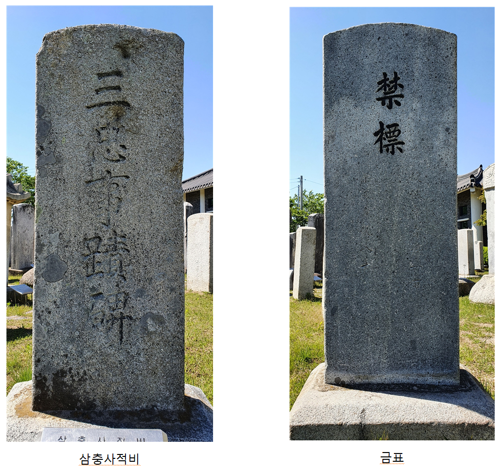 삼충사적비 옆에 禁標(금표)’라고 쓴 금표비가 있다. “이런 거 하지 마라.” 경고하는 비이다. 뭘 금지한 것일까. 금표라는 글씨 아래 작은 글씨로 새겼다. 放牲畜者杖一百 棄灰者杖八十(방생축자장일백 기회자장팔십). “가축을 놓아 기르는 자는 곤장 100, 재를 버리는 자는 곤장 80대를 때린다.”는 뜻이다. 가축 놓아 기르고 재 버리는 게 그렇게 큰 죄인가.
