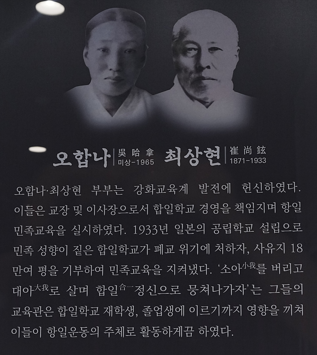 일제의 탄압으로 폐교 위기에 빠진 합일학교를, 전 재산 털어 살려낸 최상현·오합나 부부도 볼 수 있습니다. 합일초등학교에 소장된, 백범 김구의 ‘弘益人間’ 글씨가 이곳에 외출 나와 관람객을 맞습니다.