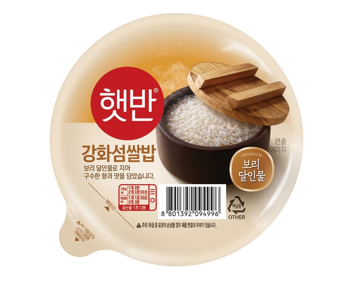 "CJ제일제당이 이마트와 함께 기획한 '햇반 강화섬쌀밥'을 출시하고 이마트·강화군과 공동 업무 협약을 맺었다고 27일 밝혔다. '햇반 강화섬쌀밥'은 이마트와 제품 콘셉트 개발 등 기획 단계부터 협업해 선보이는 7번째 제품으로, 이마트에서만 판매된다. 강화군에서 재배한 강화섬쌀을 보리 달인 물로 지어 구수하고 풍부한 맛과 향을 느낄 수 있으며, CJ제일제당의 솥밥 제조 노하우로 고슬고슬한 식감을 구현했다고 회사는 설명했다. 기존 햇반과 다르게 밥그릇 모양의 용기에 담았다."