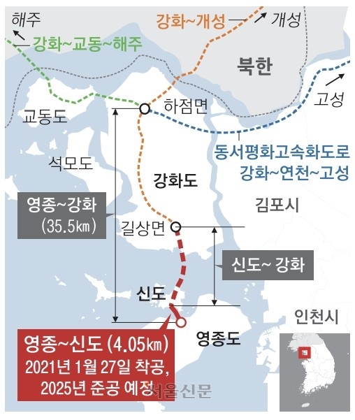 영종국제도시~신도~강화를 연결하는 이 사업은 북한 개성·해주 연결을 염두에 둔 사업으로 남북통일 이후 인천국제공항과 북한 지역의 물류 연계를 위해 계획됐다. 문재인 정부는 이 대교를 장차 강화 길상면 하점면을 거쳐 개성까지 연결하겠다고 발표했었다. 특히 강화 하점면에서는 북서쪽 교동을 거쳐 황해도 해주까지 이를 계획이었다.