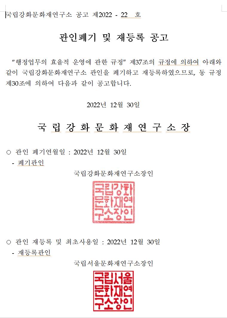 국립강화문화재연구소 관인 폐기 공고문