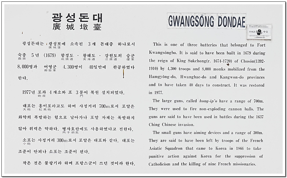광성돈대 앞 하얀 안내판 참 오래됐다.