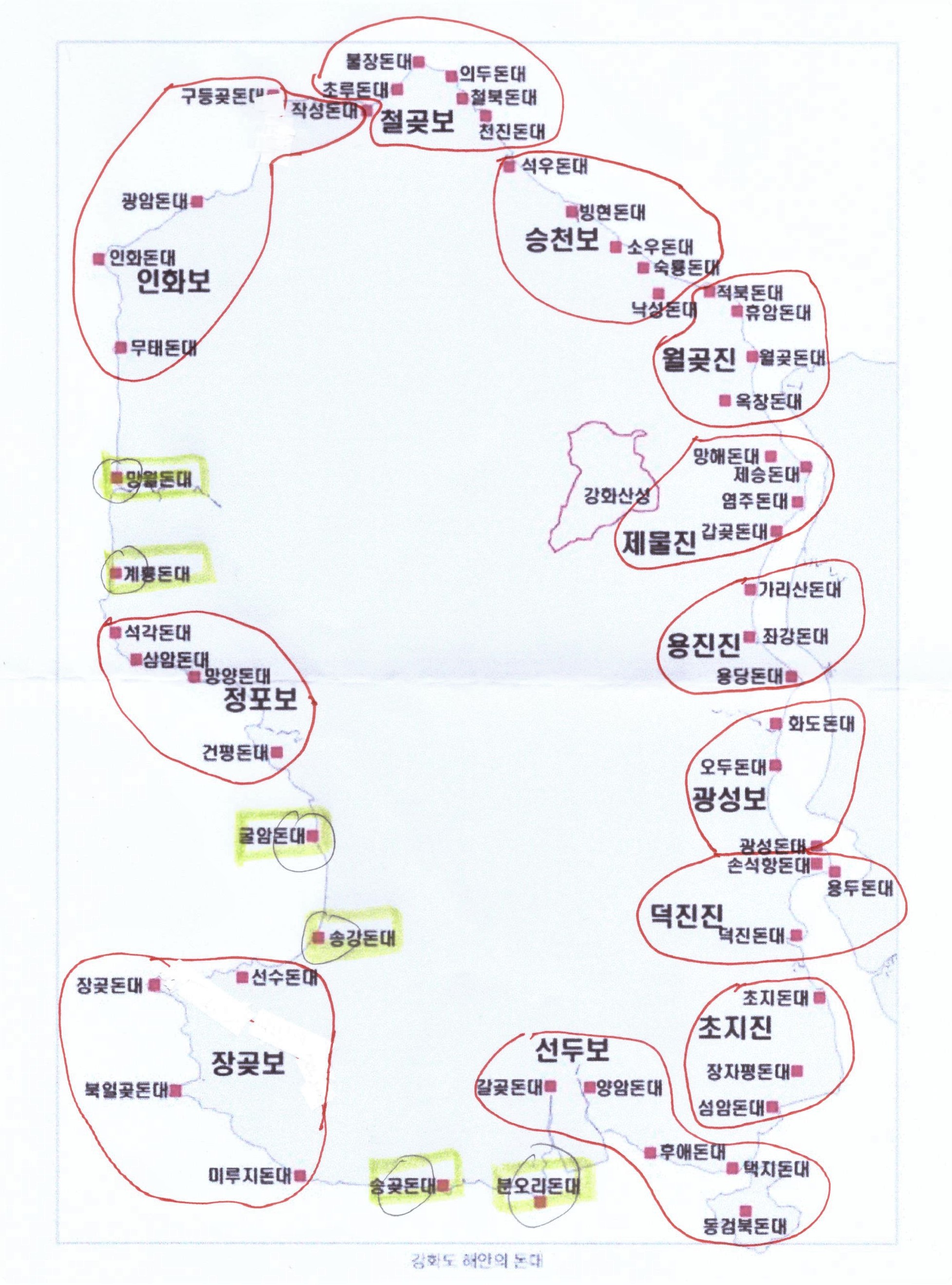 | 1679년(숙종 5) | 48 | 가리산, 갈곶, 갑곶, 건평, 계룡, 광성, 광암, 구등곶, 굴암, 낙성, 덕진, 동검북, 망양, 망월, 망해, 무태, 미곶(미루지), 분오리, 북일곶, 불장, 삼암, 석각, 석우, 섬암, 소우, 손석항(손돌목), 송강, 송곶, 숙룡, 양암, 염주, 오두, 옥창, 용당, 월곶, 의두, 인화, 장곶, 장자평, 적북, 제승, 좌강, 천진, 초지, 택지, 화도, 후애, 휴암 |