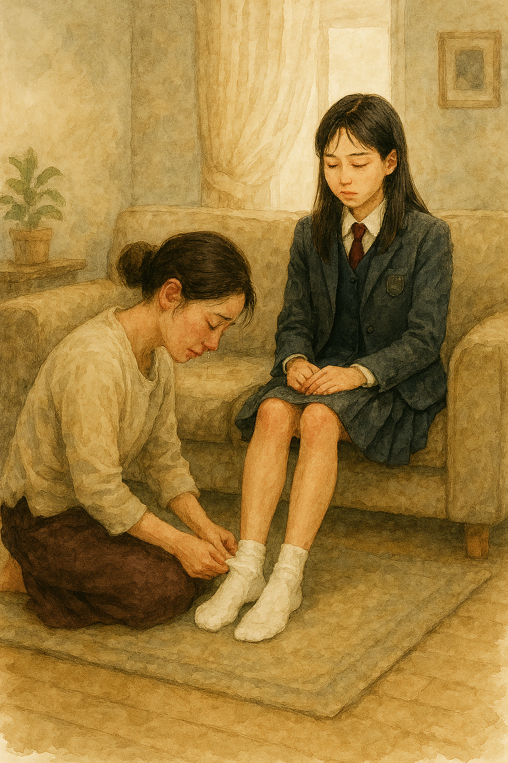 다음 날 아침, 등교 준비하는 딸아이에게 엄마는 무릎 꿇고 앉아 양말을 신겨주면서 다시 굵은 눈물을 뿌렸답니다. 다 큰 딸아이에게 양말 신겨주는 엄마의 모습, 그것도 무릎을 꿇고!