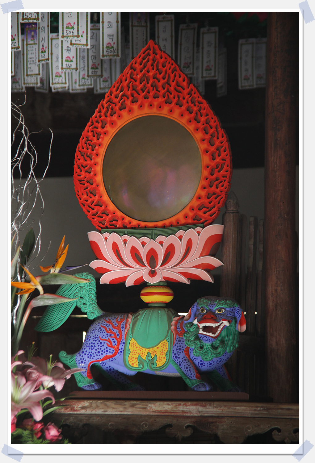 전등사 업경대는 청사자와 황사자 1쌍(2점)입니다. 청사자는 전체 높이가 110.3cm이고, 황사자는 109.4cm입니다. 둘레의 불꽃 장식과 연꽃, 사자상 받침대는 나무를 조각해서 만든 것이고, 가운데 거울은 동으로 제작한 것입니다. 진품은 전등사 수장고에 있고, 복제품이 대웅전 삼존불 좌우에 놓였습니다.