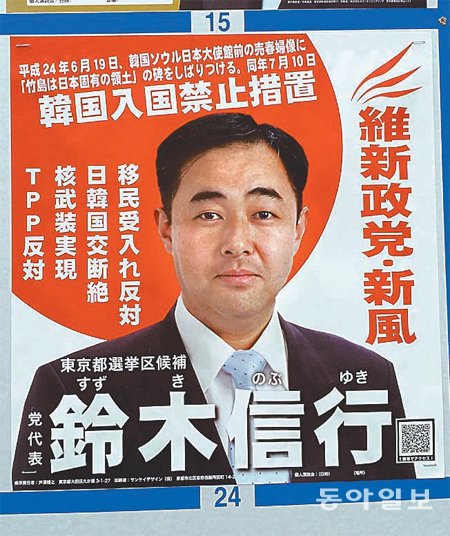 문제의 선거 벽보는 지난해 6월 주한 일본대사관 앞에 설치된 위안부 소녀상에 '말뚝 테러'를 한 극우단체 '유신정당·신풍'의 대표 스즈키 노부유키(鈴木信行·48) 씨의 홍보물이다. 도쿄 도 선거구에 입후보한 그는 벽보 상단에 "2012년 6월 19일 한국 서울 일본대사관 앞 매춘부상에 다케시마(竹島·독도의 일본식 명칭)는 일본 영토라고 적은 비(나무말뚝)를 동여맸다"며 "같은 해 7월 10일 한국 입국 금지 조치(를 당했다)"라고 적었다. 이어 자신의 얼굴 사진을 배경으로 이민 수용 반대, 일한 국교 단절, 핵무장 실현 등을 공약으로 내걸었다.”(동아일보, 2013.07.16. 배극인 기자)