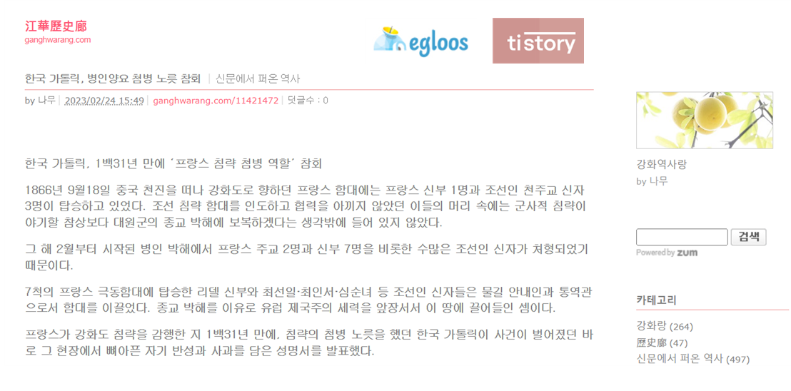 이후 언젠가 블로그 이름을 ‘江華歷史廊’으로 변경했다.