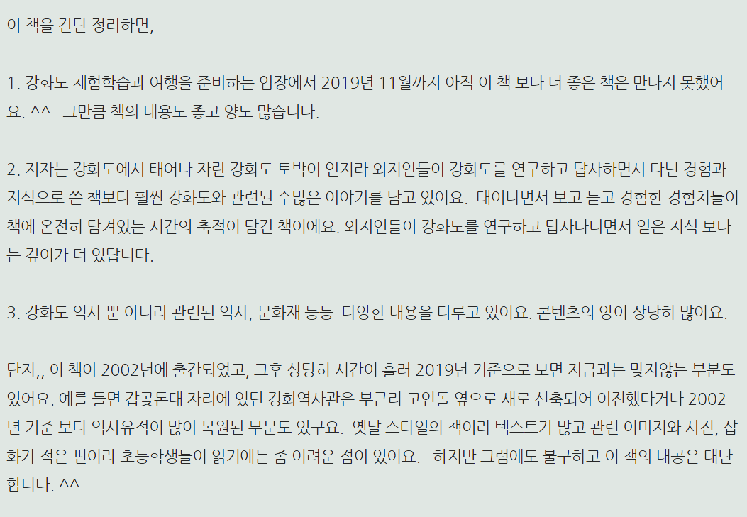 특히 초등학생이나 중학생 정도의 자녀를 두신 엄마 아빠에게 유용할 것 같습니다. 아무쪼록 이 책을 통해, 독자여러분의 강화도 여행이 그리고 역사 공부가 즐거울 수 있기를 희망합니다.