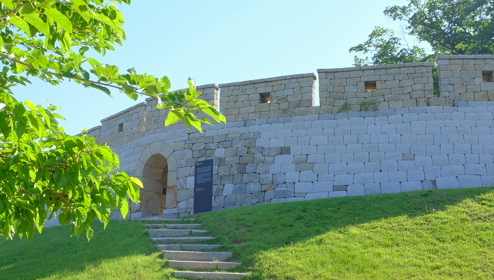 보아야 보입니다. 월곶돈대 출입문을 보세요. 이쁜 홍예문입니다. 홍예문은 한자로 虹霓門이라고 씁니다. ‘虹’도 ‘霓’도 무지개라는 뜻입니다. 다른 돈대들은 담박한 사각형 문인데 월곶돈대는 정성을 더 들여서 무지개 모양으로 만들었어요.