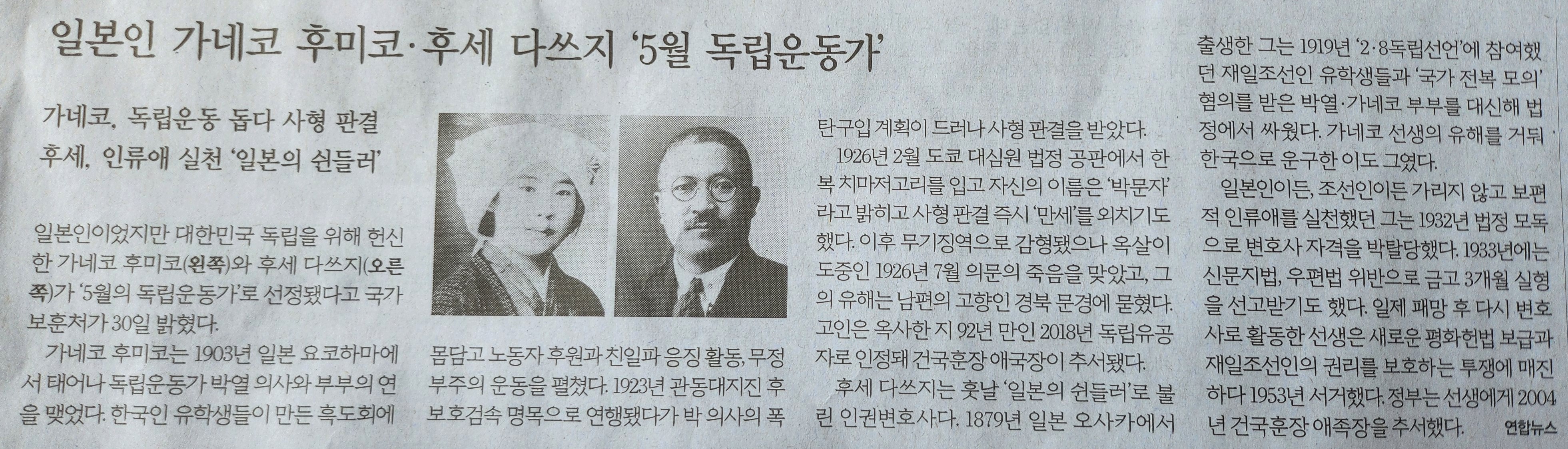 의미 있는 기사를 읽었다. 20235월의 독립운동가로 일본인 두 사람을 선정했다는 내용이다. 다음은 기사 전문이다.